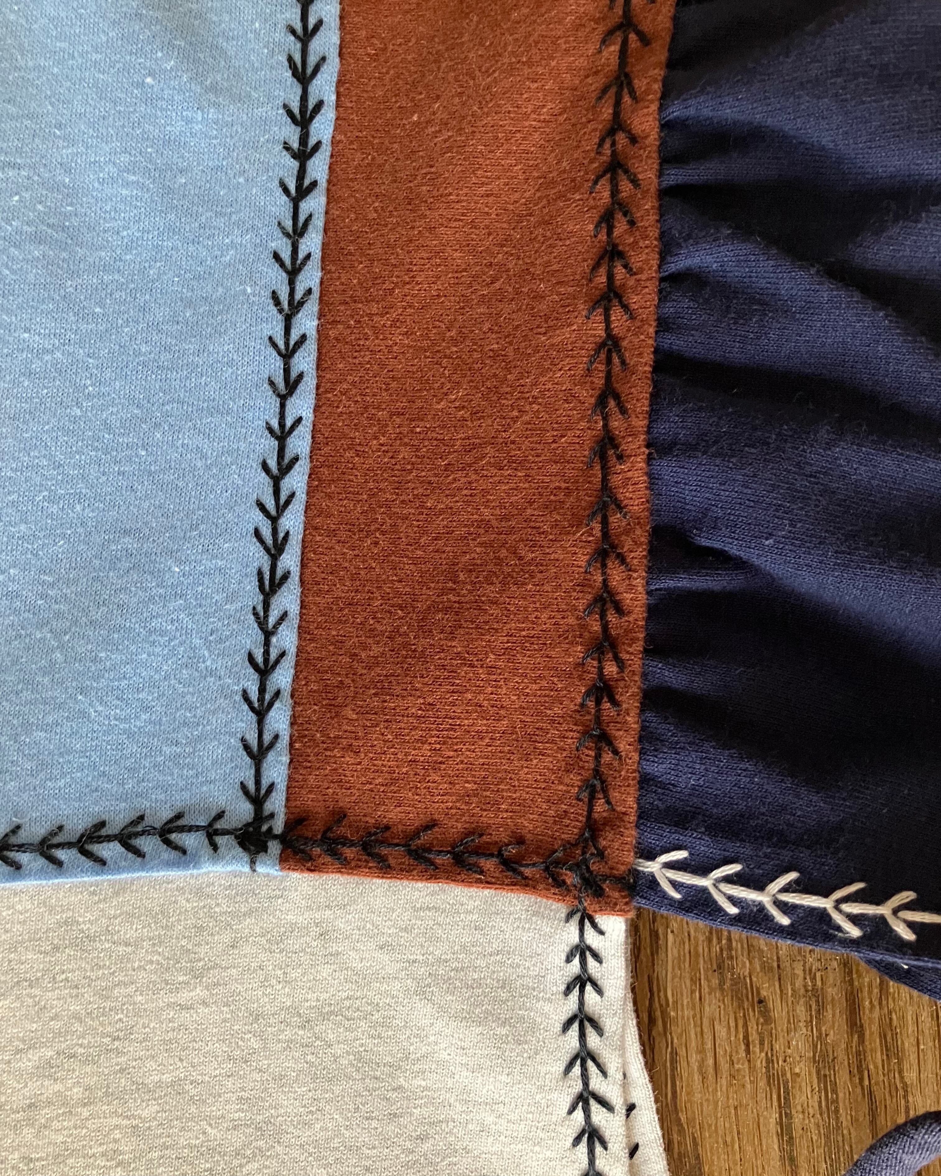 ビンテージTシャツを組み合わせ、手縫いのステッチで縫い合わせたトップスになります。