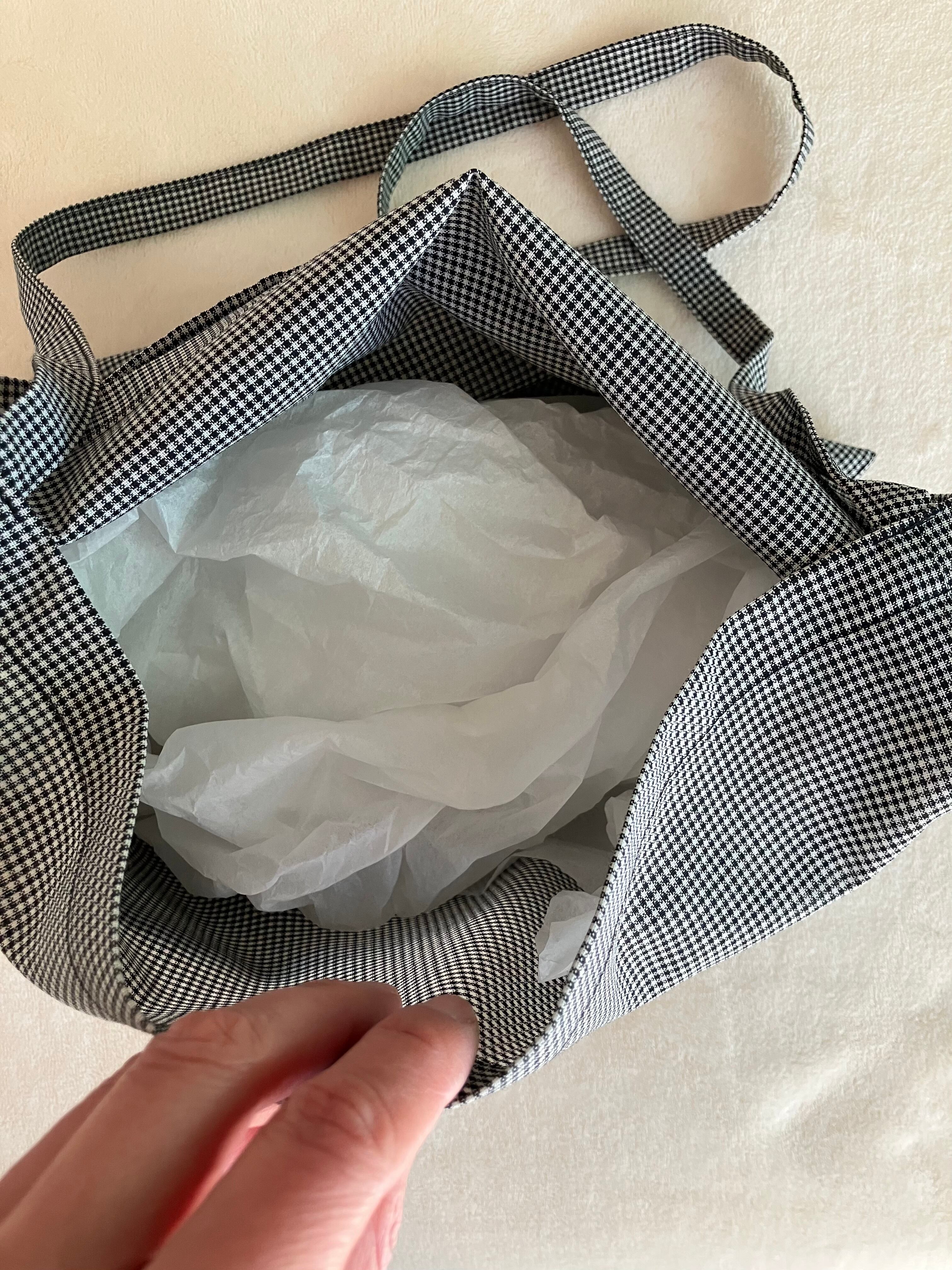 内側は四角、外側が巾着になるバッグです。 前、真ん中、後、3箇所に物が入ります。 サイズ 34cm×34cm 肩紐 105cm ビンテージの生地にビンテージのワッペンをあしらっています。 生地は白×黒の細かいチェックの織り模様です