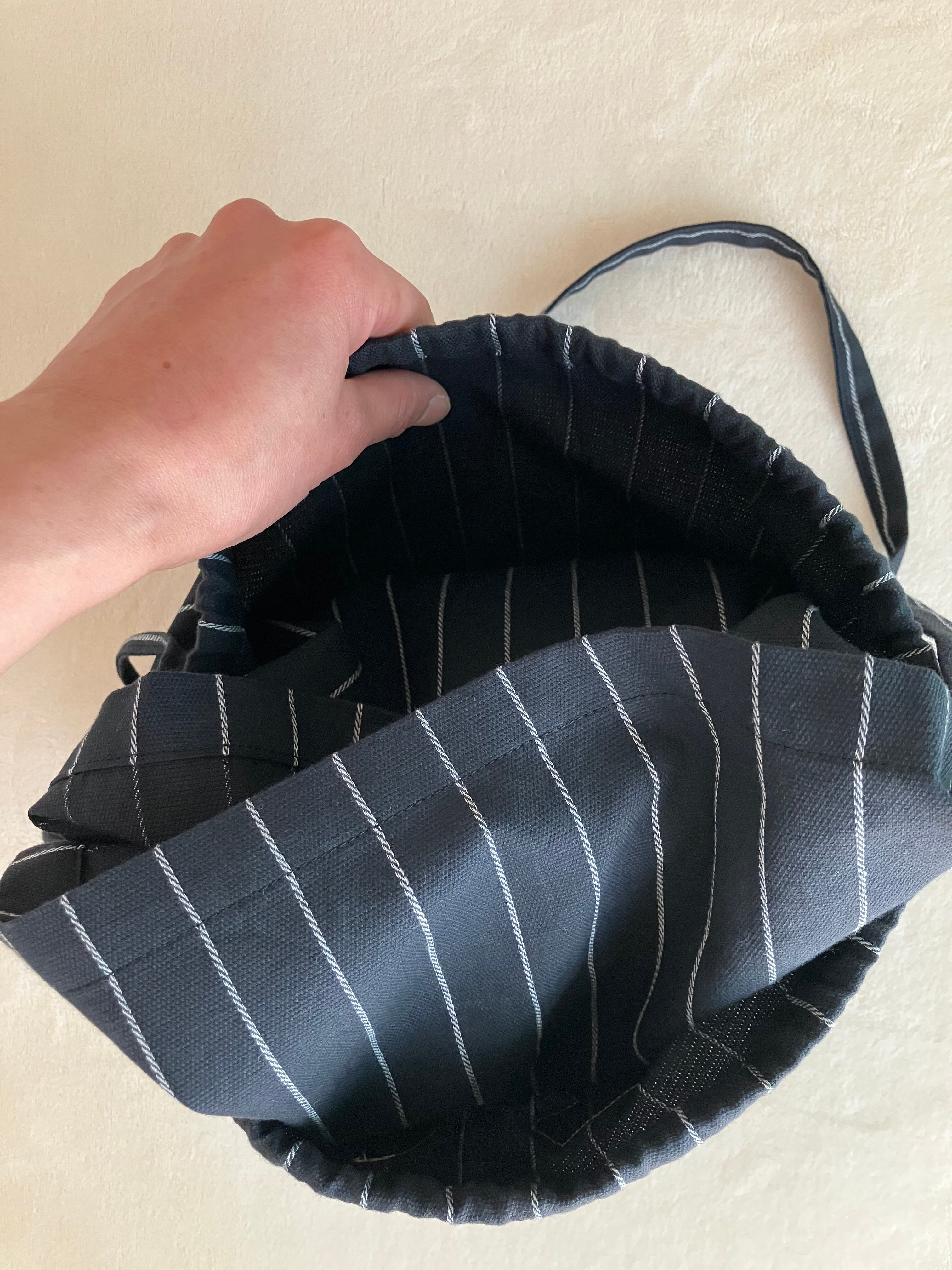 内側は四角、外側が巾着になるバッグです。 前、真ん中、後、3箇所に物が入ります。 サイズ 34cm×34cm 肩紐 105cm ビンテージの生地にビンテージのワッペンをあしらっています。 生地は黒に近いチャコールグレーに白のピンストライプです