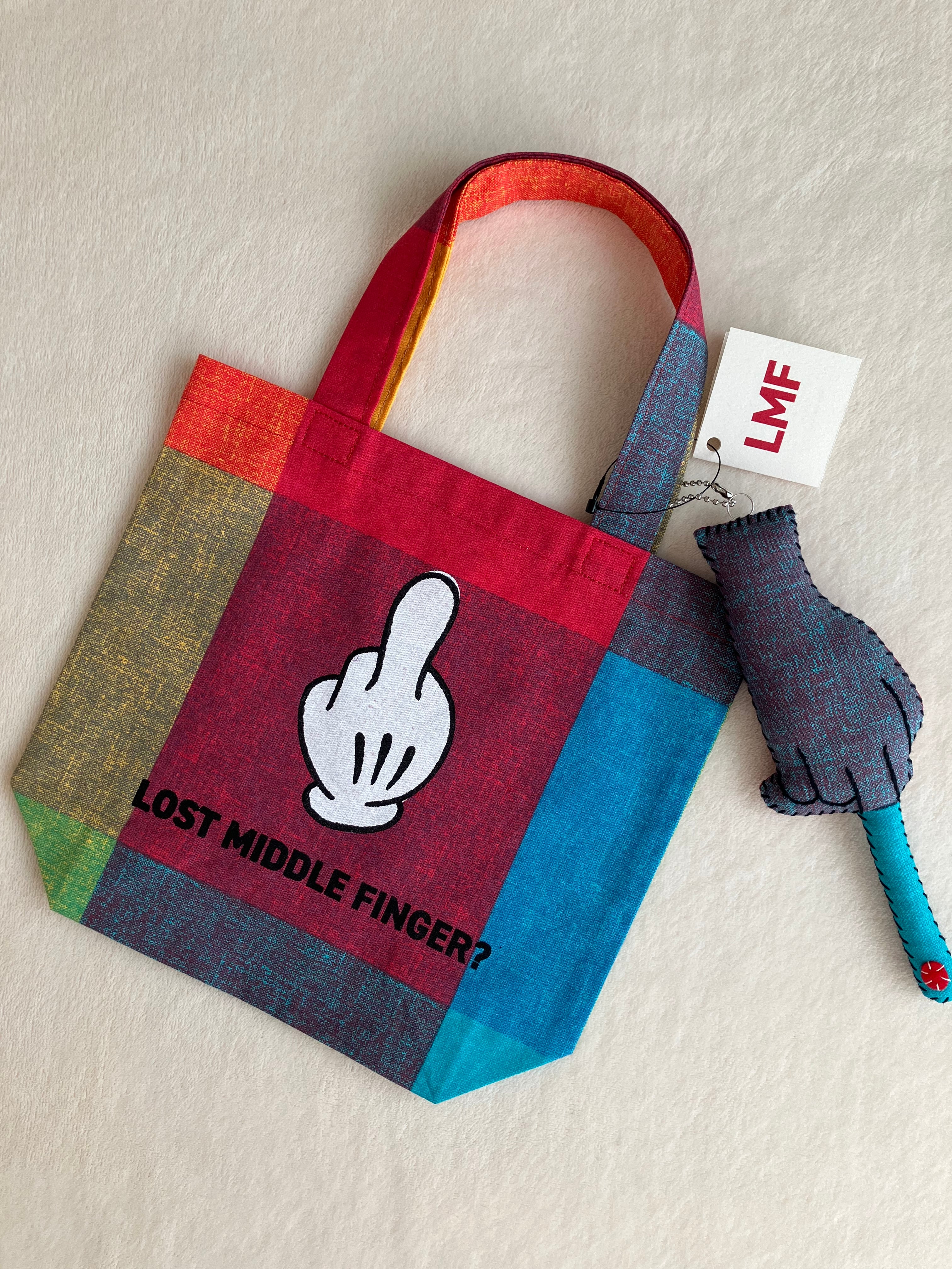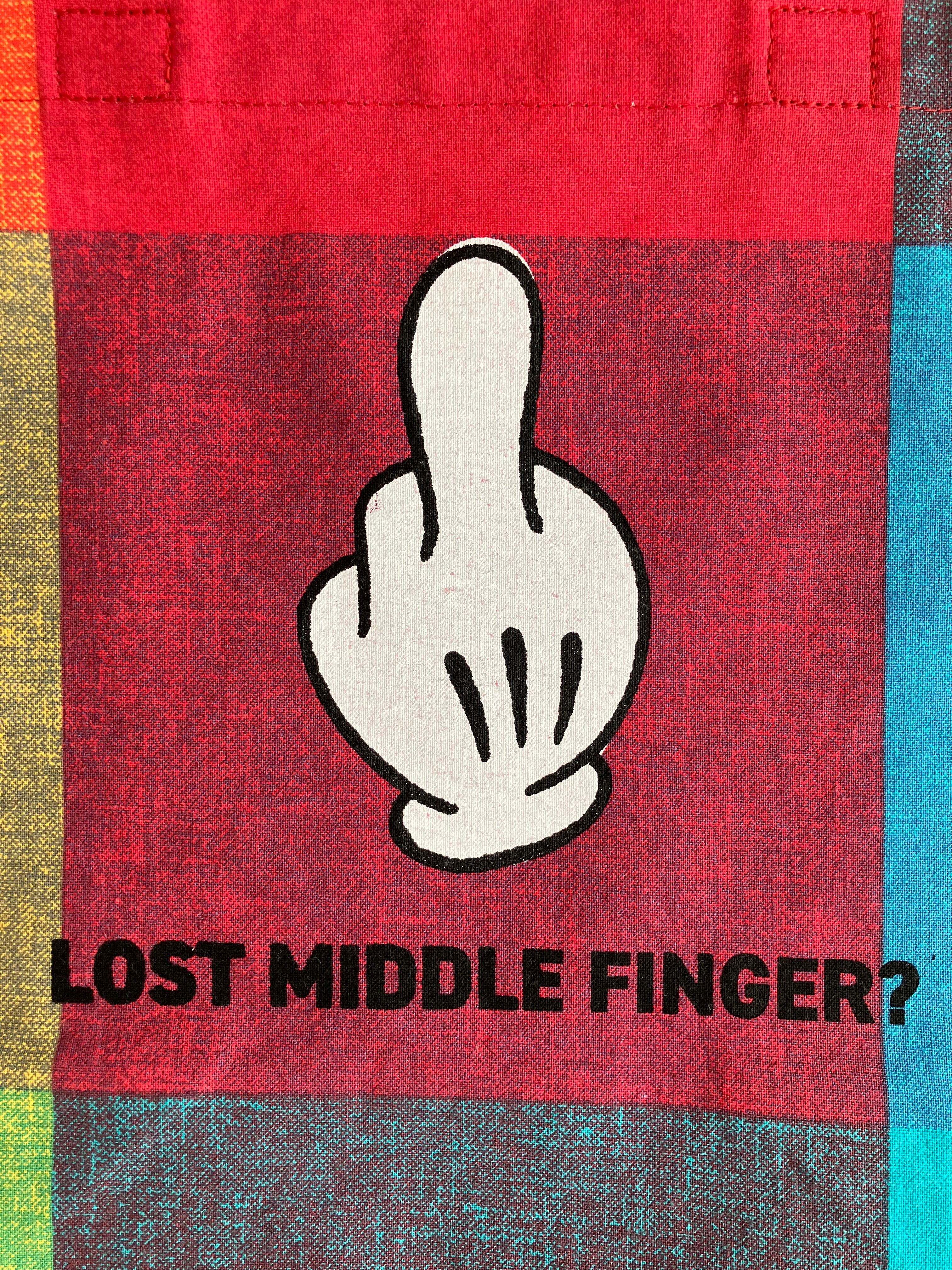見覚えのあるキャラクターたちの指は大体4本しかない事から、LOST MIDDLE FINGER? ビンテージの生地で作ったバッグにシルクスクリーンを刷りました。 同じ生地のLONG MIDDLE FINGER キーホルダーもセットで サイズ 縦 23cm 横 25cm マチ 8cm