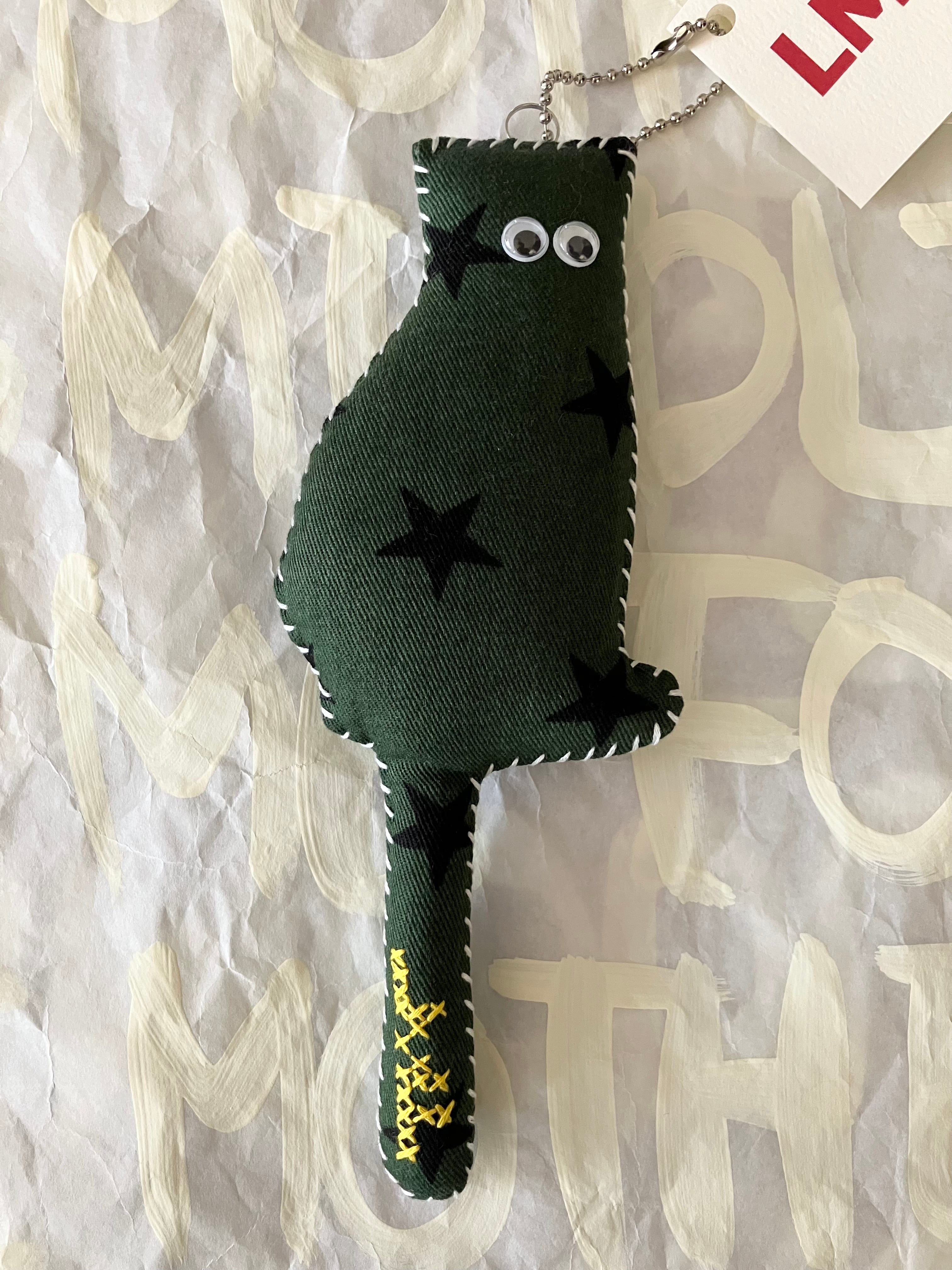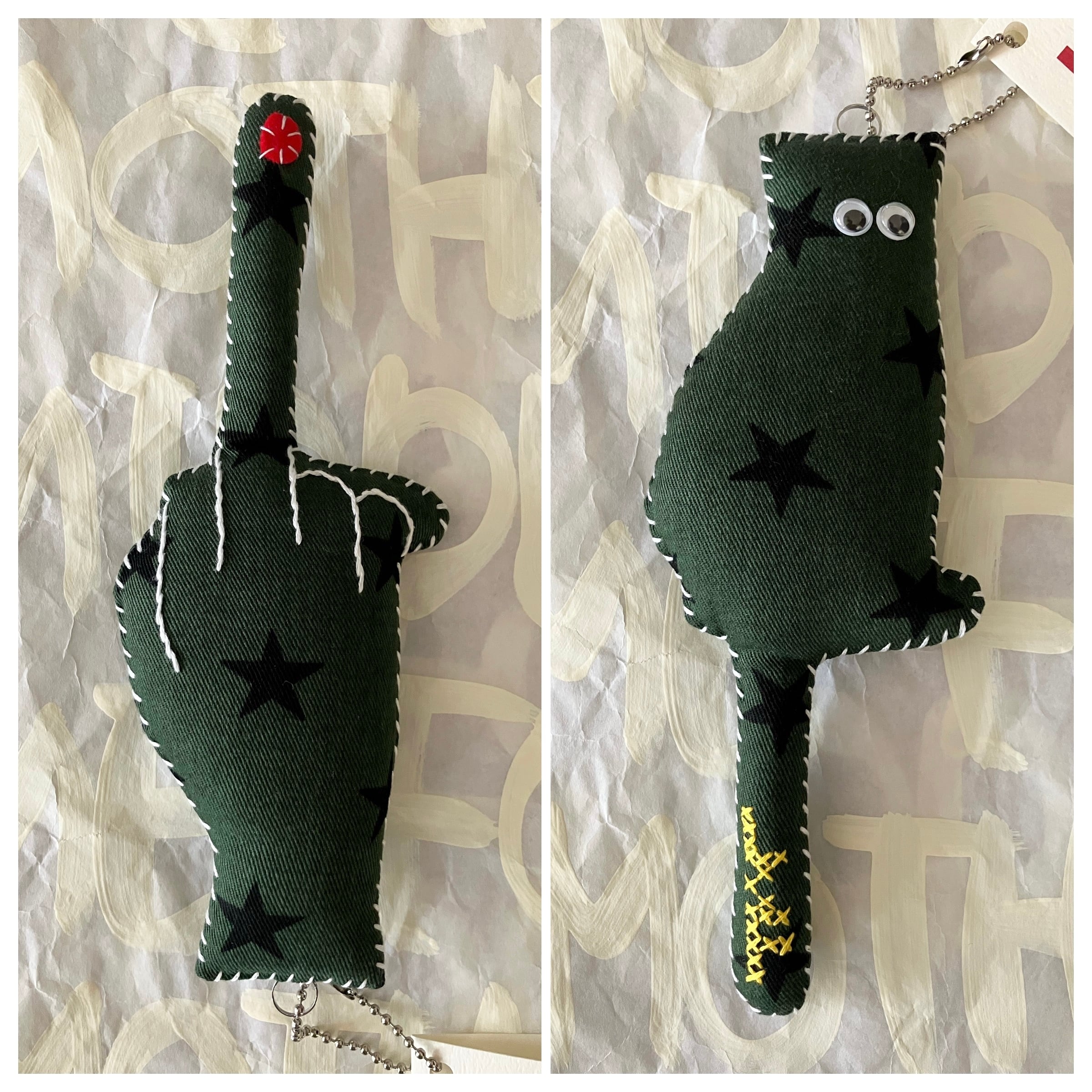 映画"EVERYTHING EVERYWHERE ALL AT ONCE"に触発されて作った"LMF"(中指をひっくり返すと猫になる)シリーズのキーホルダーです サイズ 縦19cm 横7cm 厚み3cm グリーンに黒の星★柄のコットン生地を使用、ステッチは全て手縫いです