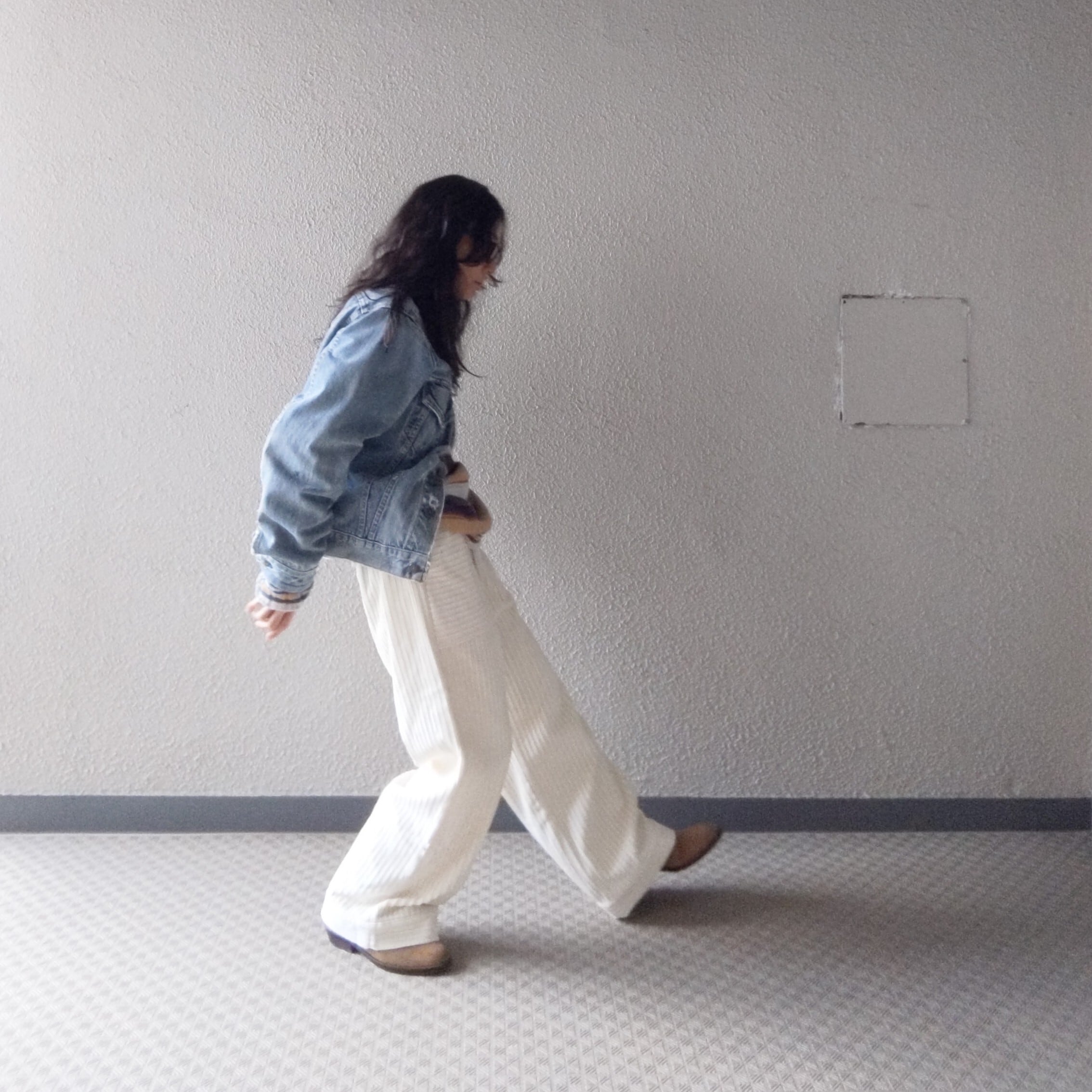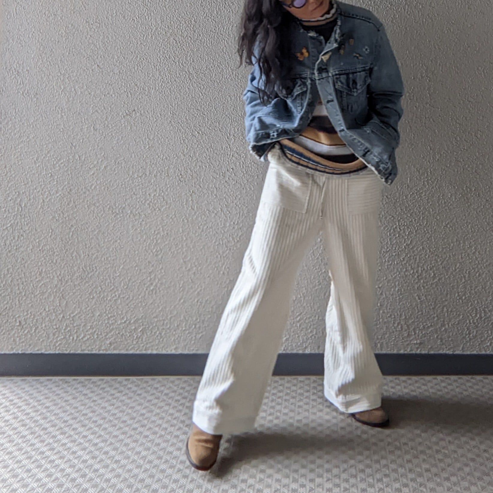 ポケットと裾の切り替えは生地の向きを変えてアクセントにしています